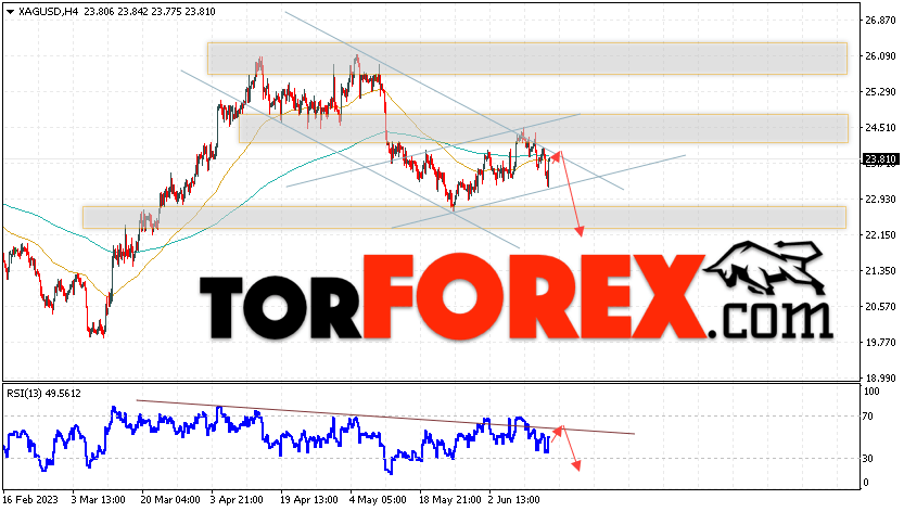 Дополнительным сигналом в пользу снижения котировок и цен на Серебро XAG/USD выступит тест линии сопротивления на индикаторе относительной силы (RSI). Вторым сигналом в пользу падения станет отскок от верхней границы медвежьего канала. Отменой варианта снижения цен на Серебро 16 июня 2023 станет сильный рост и пробой 24.45. Это укажет на пробой области сопротивления и продолжение роста в область выше уровня 26.75. Ожидать ускорения падения котировок XAG/USD стоит с пробоем области поддержки и закрытием цены под уровнем 22.90, что укажет на пробой нижней границы бычьего канала коррекции.