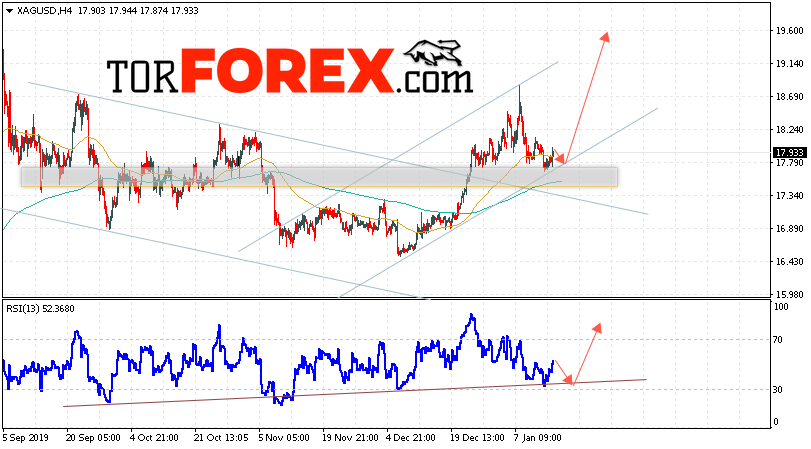 Дополнительным сигналом в пользу роста котировок и цен на Серебро XAG/USD выступит тест линии тренда на индикаторе относительной силы. Вторым сигналом в пользу подъёма станет отскок от нижней границы восходящего канала. Отменой варианта роста цен на Серебро 16 января 2020 станет падение и пробой 17.25. Это укажет на пробой области поддержки и продолжение падения в область ниже уровня 16.85. Ожидать ускорения роста котировок XAG/USD стоит с пробоем области сопротивления и закрытием над уровнем 18.35.