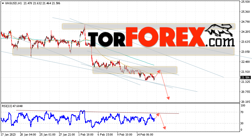Дополнительным сигналом в пользу снижения котировок и цен на Серебро XAG/USD выступит тест линии поддержки на индикаторе относительной силы (RSI). Вторым сигналом в пользу снижения станет отскок от верхней границы медвежьего канала. Отменой варианта падения цен на Серебро 17 февраля 2023 станет падение и пробой 22.55. Это укажет на пробой области сопротивления и продолжение роста в область выше уровня 23.95. Ожидать ускорения падения котировок XAG/USD стоит с пробоем области поддержки и закрытием цены под уровнем 21.05.