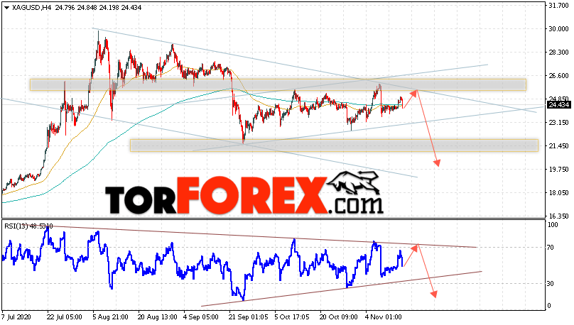 Дополнительным сигналом в пользу снижения котировок и цен на Серебро XAG/USD выступит тест линии сопротивления на индикаторе относительной силы. Вторым сигналом в пользу падения станет отскок от верхней границы нисходящего канала. Отменой варианта падения цен на Серебро 17 ноября 2020 станет сильный рост и пробой 26.65. Это укажет на пробой области сопротивления и продолжение роста в область выше уровня 28.95. Ожидать ускорения падения котировок XAG/USD стоит с пробоем области поддержки и закрытием цен под уровнем 22.95Ю, что укажет на пробой нижней границы восходящего канала.