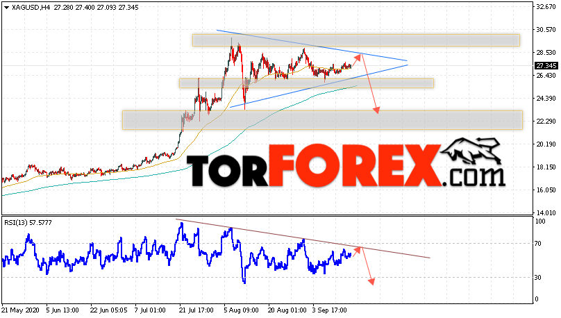 Дополнительным сигналом в пользу падения котировок и цен на Серебро XAG/USD выступит тест линии сопротивления на индикаторе относительной силы. Вторым сигналом в пользу снижения станет отскок от верхней границы модели ”Треугольник”. Отменой варианта падения цен на Серебро 17 сентября 2020 станет сильный рост и пробой 29.75. Это укажет на пробой области сопротивления и продолжение подъёма в область выше уровня 32.45. Ожидать ускорения падения котировок XAG/USD стоит с пробоем области поддержки и закрытием цен под уровнем 25.55, что укажет на завершение формирования модели ”Треугольник”.