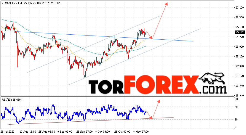 Дополнительным сигналом в пользу подъёма котировок и цен на Серебро XAG/USD выступит тест линии тренда на индикаторе относительной силы (RSI). Вторым сигналом в пользу роста станет отскок от линии ”Шеи” разворотной модели ”Голова и плечи”. Отменой варианта подъёма цен на Серебро 18 ноября 2021 станет падение и пробой 23.15. Это укажет на пробой области поддержки и продолжение падения в область ниже уровня 21.65. Ожидать ускорения подъёма котировок XAG/USD стоит с пробоем области сопротивления и закрытием цены над уровнем 25.75.