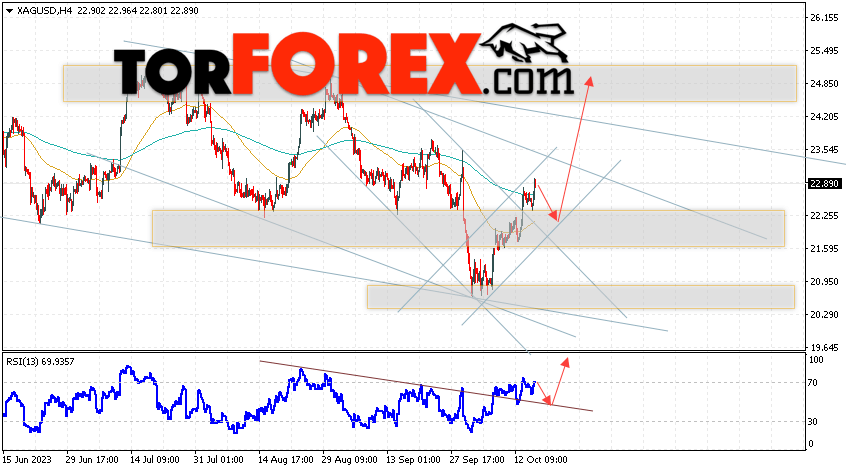 Дополнительным сигналом в пользу роста котировок и цен на Серебро XAG/USD выступит тест линии поддержки на индикаторе относительной силы (RSI). Вторым сигналом в пользу подъёма станет отскок от нижней границы бычьего канала. Отменой варианта роста цен на Серебро 18 октября 2023 станет падение и пробой 21.55. Это укажет на пробой области поддержки и продолжение падения в область ниже уровня 19.25. Ожидать ускорения роста котировок XAG/USD стоит с пробоем области сопротивления и закрытием цены над уровнем 23.65, что укажет на пробой верхней границы нисходящего канала.