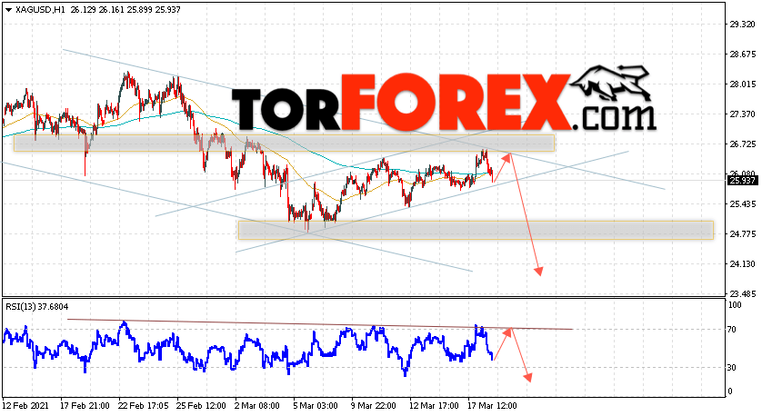Дополнительным сигналом в пользу падения котировок и цен на Серебро XAG/USD выступит тест линии сопротивления на индикаторе относительной силы. Вторым сигналом в пользу снижения станет отскок от верхней границы нисходящего канала. Отменой варианта падения цен на Серебро 19 марта 2021 станет сильный рост и пробой 27.45. Это укажет на пробой области сопротивления и продолжение подъёма в область выше уровня 28.85. Ожидать ускорения падения котировок XAG/USD стоит с пробоем области поддержки и закрытием цены под уровнем 25.25.
