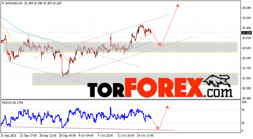 Дополнительным сигналом в пользу подъёма котировок и цен на Серебро XAG/USD выступит тест линии тренда на индикаторе относительной силы (RSI). Вторым сигналом в пользу роста станет отскок от нижней границы бычьего канала. Отменой варианта подъёма цен на Серебро 19 октября 2021 станет падение и пробой 22.05. Это укажет на пробой области поддержки и продолжение падения в область ниже уровня 18.15. Ожидать ускорения подъёма котировок XAG/USD стоит с пробоем области сопротивления и закрытием цены над уровнем 23.85.