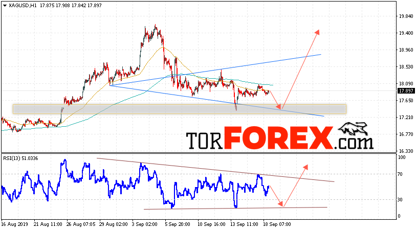 В пользу роста котировок и цен на Серебро XAG/USD выступит тест восходящей линии поддержки на индикаторе относительной силы. Вторым сигналом пользу подъёма станет отскок от нижней границы модели. Отменой варианта роста цен на Серебро 19 сентября 2019 станет сильное падение и пробой 17.05. Это укажет на пробой нижней границы модели и продолжение падения в область ниже уровня 16.65. Ожидать ускорения роста котировок XAG/USD стоит с пробоем области сопротивления и закрытием над уровнем 18.15.
