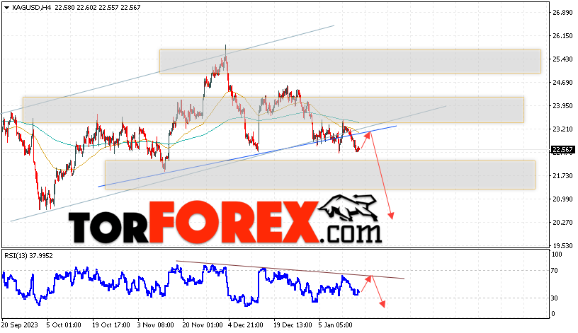 Дополнительным сигналом в пользу падения котировок и цен на Серебро XAG/USD выступит тест линии сопротивления на индикаторе относительной силы (RSI). Вторым сигналом в пользу снижения станет отскок от нижней границы разворотной модели «Голова и плечи». Отменой варианта падения цен на Серебро 19 января 2024 станет сильный рост и пробой 23.85. Это укажет на пробой области сопротивления и продолжение роста в область выше уровня 25.75. Ожидать ускорения падения котировок XAG/USD стоит с пробоем области поддержки и закрытием цены под уровнем 22.25.