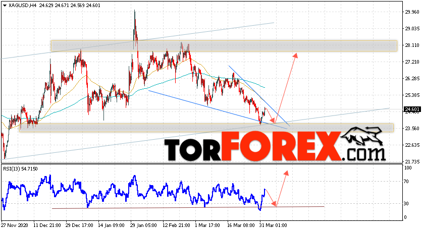 Дополнительным сигналом в пользу роста котировок и цен на Серебро XAG/USD выступит тест линии сопротивления на индикаторе относительной силы. Вторым сигналом в пользу подъёма станет отскок от нижней границы модели ”Клин”. Отменой варианта роста цен на Серебро 2 апреля 2021 станет падение и пробой 23.05. Это укажет на пробой области поддержки и продолжение падения в область ниже уровня 21.05. Ожидать ускорения подъёма котировок XAG/USD стоит с пробоем области сопротивления и закрытием цены над уровнем 25.25, что укажет на пробой верхней границы модели ”Клин”.