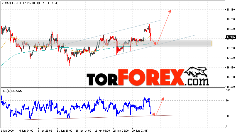 Дополнительным сигналом в пользу подъёма котировок и цен на Серебро XAG/USD выступит тест линии поддержки на индикаторе относительной силы. Вторым сигналом в пользу роста станет отскок от нижней границы восходящего канала. Отменой варианта роста цен на Серебро 2 июля 2020 станет падение и пробой 17.20. Это укажет на пробой области поддержки и продолжение падения в область ниже уровня 16.05. Ожидать ускорения роста котировок XAG/USD стоит с пробоем области сопротивления и закрытием цен над уровнем 18.55.