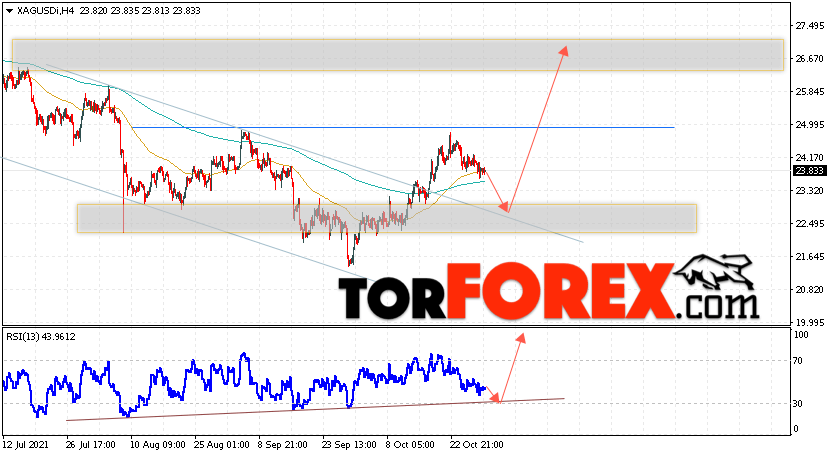 Дополнительным сигналом в пользу подъёма котировок и цен на Серебро XAG/USD выступит тест линии тренда на индикаторе относительной силы (RSI). Вторым сигналом в пользу роста станет отскок от верхней границы медвежьего канала. Отменой варианта подъёма цен на Серебро 2 ноября 2021 станет падение и пробой 21.55. Это укажет на пробой области поддержки и продолжение падения в область ниже уровня 17.25. Ожидать ускорения подъёма котировок XAG/USD стоит с пробоем области сопротивления и закрытием цены над уровнем 25.25, что укажет на завершение формирования разворотной модели ”Голова и плечи”.