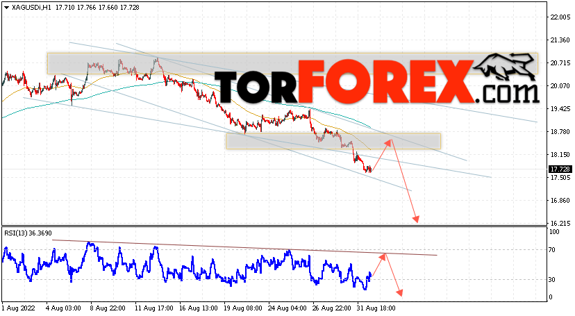 Дополнительным сигналом в пользу падения котировок и цен на Серебро XAG/USD выступит тест линии сопротивления на индикаторе относительной силы (RSI). Вторым сигналом в пользу падения станет отскок от верхней границы нисходящего канала. Отменой варианта падения цен на Серебро 2 сентября 2022 станет сильный рост и пробой 19.25. Это укажет на пробой области сопротивления и продолжение роста в область выше уровня 21.85. Ожидать ускорения падения котировок XAG/USD стоит с пробоем области поддержки и закрытием цены под уровнем 17.25.