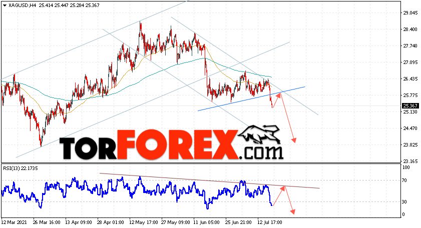 Дополнительным сигналом в пользу снижения котировок и цен на Серебро XAG/USD выступит тест линии сопротивления на индикаторе относительной силы (RSI). Вторым сигналом в пользу падения станет отскок от верхней границы нисходящего канала. Отменой варианта падения цен на Серебро 20 июля 2021 станет сильный рост и пробой 26.45. Это укажет на пробой области сопротивления и продолжение подъёма в область выше уровня 28.45. Ожидать ускорения падения котировок XAG/USD стоит с пробоем области поддержки и закрытием цены под уровнем 24.85.