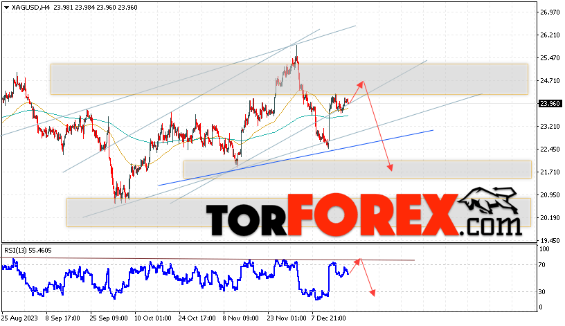 Дополнительным сигналом в пользу падения котировок и цен на Серебро XAG/USD выступит тест линии сопротивления на индикаторе относительной силы (RSI). Вторым сигналом в пользу снижения станет отскок от верхней границы разворотной модели «Голова и плечи». Отменой варианта падения цен на Серебро 21 декабря 2023 станет сильный рост и пробой 25.95. Это укажет на пробой области сопротивления и продолжение роста в область выше уровня 27.25. Ожидать ускорения падения котировок XAG/USD стоит с пробоем области поддержки и закрытием цены под уровнем 22.25, что укажет на пробой нижней границы разворотной модели «Голова и плечи» и начало отработки паттерна с целями внизу.