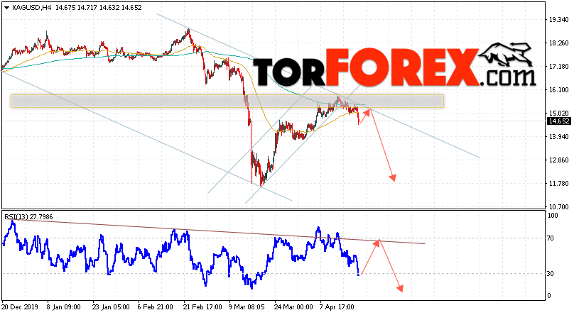 Дополнительным сигналом в пользу падения котировок и цен на Серебро XAG/USD выступит тест линии сопротивления на индикаторе относительной силы. Вторым сигналом в пользу снижения станет отскок от верхней границы нисходящего канала. Отменой варианта падения цен на Серебро 22 апреля 2020 станет сильный рост и пробой 16.15. Это укажет на пробой области сопротивления и продолжение роста в область выше уровня 18.05. Ожидать ускорения падения котировок XAG/USD стоит с пробоем области поддержки и закрытием цен под уровнем 13.95.