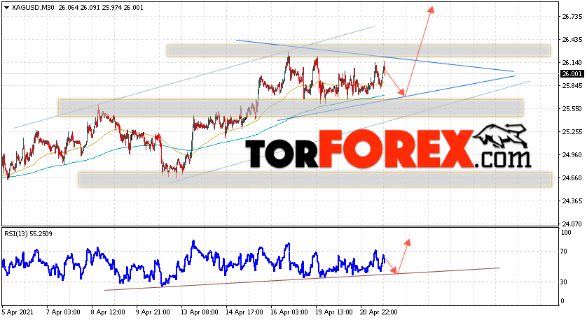 Дополнительным сигналом в пользу роста котировок и цен на Серебро XAG/USD выступит тест линии поддержки на индикаторе относительной силы. Вторым сигналом в пользу подъёма станет отскок от нижней границы модели ”Треугольник”. Отменой варианта роста цен на Серебро 22 апреля 2021 станет падение и пробой 25.25. Это укажет на пробой области поддержки и продолжение падения в область ниже уровня 23.15. Ожидать ускорения подъёма котировок XAG/USD стоит с пробоем области сопротивления и закрытием цены над уровнем 26.55, что укажет на пробой верхней границы модели ”Треугольник”.