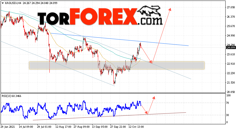Дополнительным сигналом в пользу подъёма котировок и цен на Серебро XAG/USD выступит тест линии тренда на индикаторе относительной силы (RSI). Вторым сигналом в пользу роста станет отскок от верхней границы медвежьего канала. Отменой варианта подъёма цен на Серебро 22 октября 2021 станет падение и пробой 21.55. Это укажет на пробой области поддержки и продолжение падения в область ниже уровня 17.35. Ожидать ускорения подъёма котировок XAG/USD стоит с пробоем области сопротивления и закрытием цены над уровнем 25.05, что укажет на завершение формирования разворотной модели ”Голова и плечи”.