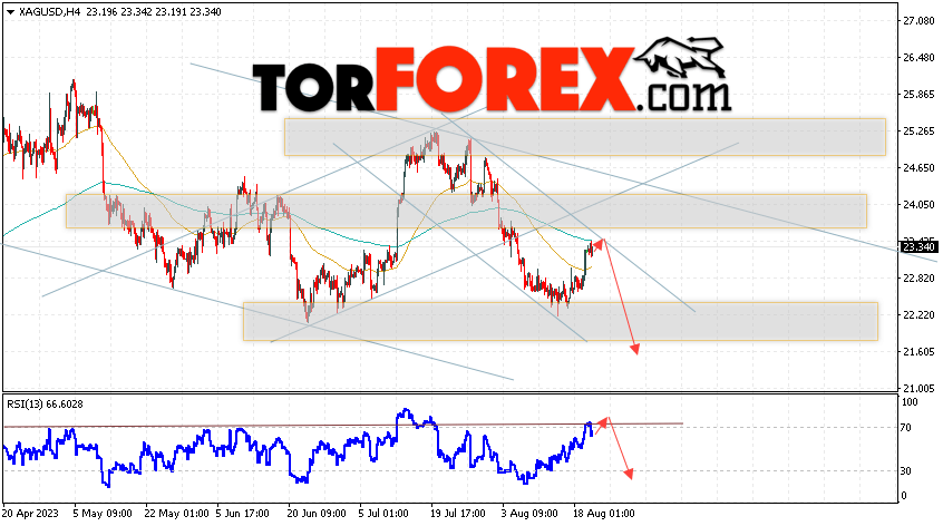 Дополнительным сигналом в пользу падения котировок и цен на Серебро XAG/USD выступит тест линии сопротивления на индикаторе относительной силы (RSI). Вторым сигналом в пользу снижения станет отскок от верхней границы медвежьего канала. Отменой варианта снижения цен на Серебро 23 августа 2023 станет сильный рост и пробой 23.65. Это укажет на пробой области сопротивления и продолжение роста в область выше уровня 25.25. Ожидать ускорения падения котировок XAG/USD стоит с пробоем области поддержки и закрытием цены под уровнем 22.75.