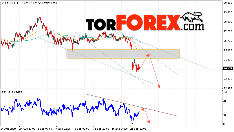 Дополнительным сигналом в пользу падения котировок и цен на Серебро XAG/USD выступит тест линии сопротивления на индикаторе относительной силы. Вторым сигналом в пользу снижения станет отскок от верхней границы нисходящего канала. Отменой варианта падения цен на Серебро 23 сентября 2020 станет сильный рост и пробой 26.75. Это укажет на пробой области сопротивления и продолжение подъёма в область выше уровня 29.85. Ожидать ускорения падения котировок XAG/USD стоит с пробоем области поддержки и закрытием цен под уровнем 23.35.
