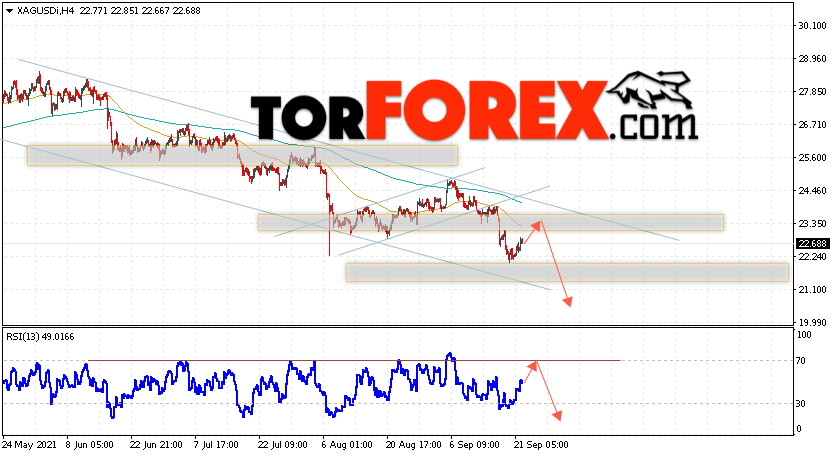 Дополнительным сигналом в пользу падения котировок и цен на Серебро XAG/USD выступит тест линии тренда на индикаторе относительной силы (RSI). Вторым сигналом в пользу снижения станет отскок от верхней границы нисходящего канала. Отменой варианта падения цен на Серебро 23 сентября 2021 станет сильный рост и пробой 24.65. Это укажет на пробой области сопротивления и продолжение подъёма в область выше уровня 25.95. Ожидать ускорения падения котировок XAG/USD стоит с пробоем области поддержки и закрытием цены под уровнем 21.95.