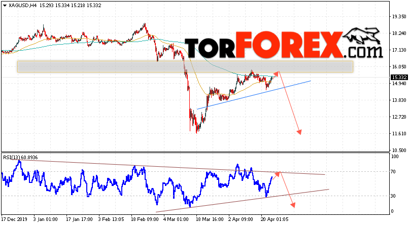 Дополнительным сигналом в пользу падения котировок и цен на Серебро XAG/USD выступит тест линии сопротивления на индикаторе относительной силы. Вторым сигналом в пользу снижения станет завершение формирования разворотной модели «Голова и плечи». Отменой варианта падения цен на Серебро 24 апреля 2020 станет сильный рост и пробой 16.25. Это укажет на пробой области сопротивления и продолжение роста в область выше уровня 18.05. Ожидать ускорения падения котировок XAG/USD стоит с пробоем области поддержки и закрытием цен под уровнем 13.95.