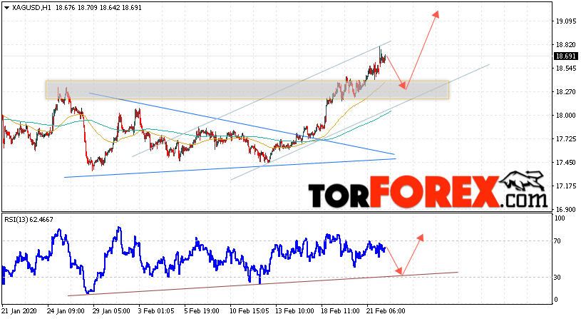 Дополнительным сигналом в пользу роста котировок и цен на Серебро XAG/USD выступит тест области поддержки на индикаторе относительной силы. Вторым сигналом в пользу подъёма станет отскок от нижней границы восходящего канала. Отменой варианта роста цен на Серебро 25 февраля 2020 станет падение и пробой 18.05. Это укажет на пробой области поддержки и продолжение падения в область ниже уровня 17.25. Ожидать ускорения роста котировок XAG/USD стоит с пробоем области сопротивления и закрытием над уровнем 19.05.