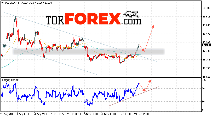 Дополнительным сигналом в пользу роста котировок и цен на Серебро XAG/USD выступит тест линии поддержки на индикаторе относительной силы. Вторым сигналом в пользу подъёма станет отскок от верхней границы нисходящего канала. Отменой варианта роста цен на Серебро 26 декабря 2019 станет падение и пробой 16.85. Это укажет на пробой области поддержки и продолжение падения в область ниже уровня 16.15. Ожидать ускорения роста котировок XAG/USD стоит с пробоем области сопротивления и закрытием над уровнем 18.05.