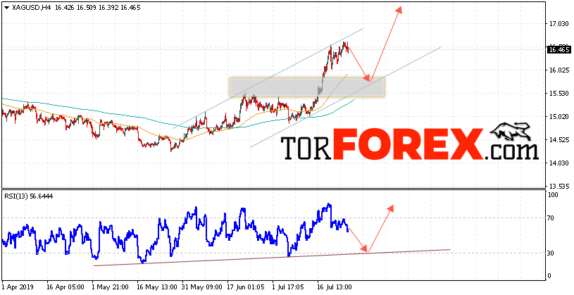 В пользу роста котировок XAG/USD выступит тест линии поддержки на индикаторе относительной силы. Вторым сигналом станет отскок от нижней границы восходящего канала. Отменой варианта роста цен на Серебро 26 июля 2019 станет падение и пробой 15.75. Это укажет на пробой области поддержки и продолжение падения в область ниже уровня 15.25. Ожидать ускорения роста котировок XAG/USD стоит с пробоем области сопротивления и закрытием над уровнем 16.65.