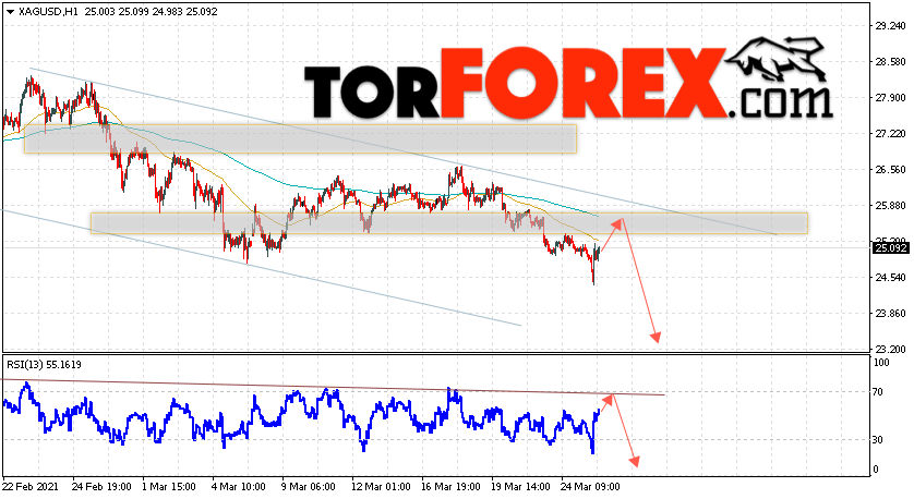 Дополнительным сигналом в пользу падения котировок и цен на Серебро XAG/USD выступит тест линии сопротивления на индикаторе относительной силы. Вторым сигналом в пользу снижения станет отскок от верхней границы нисходящего канала. Отменой варианта падения цен на Серебро 26 марта 2021 станет сильный рост и пробой 26.65. Это укажет на пробой области сопротивления и продолжение подъёма в область выше уровня 28.95. Ожидать ускорения падения котировок XAG/USD стоит с пробоем области поддержки и закрытием цены под уровнем 23.75.