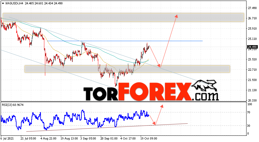 Дополнительным сигналом в пользу подъёма котировок и цен на Серебро XAG/USD выступит тест линии тренда на индикаторе относительной силы (RSI). Вторым сигналом в пользу роста станет отскок от верхней границы медвежьего канала. Отменой варианта подъёма цен на Серебро 26 октября 2021 станет падение и пробой 21.55. Это укажет на пробой области поддержки и продолжение падения в область ниже уровня 17.35. Ожидать ускорения подъёма котировок XAG/USD стоит с пробоем области сопротивления и закрытием цены над уровнем 25.25, что укажет на завершение формирования разворотной модели ”Голова и плечи”.