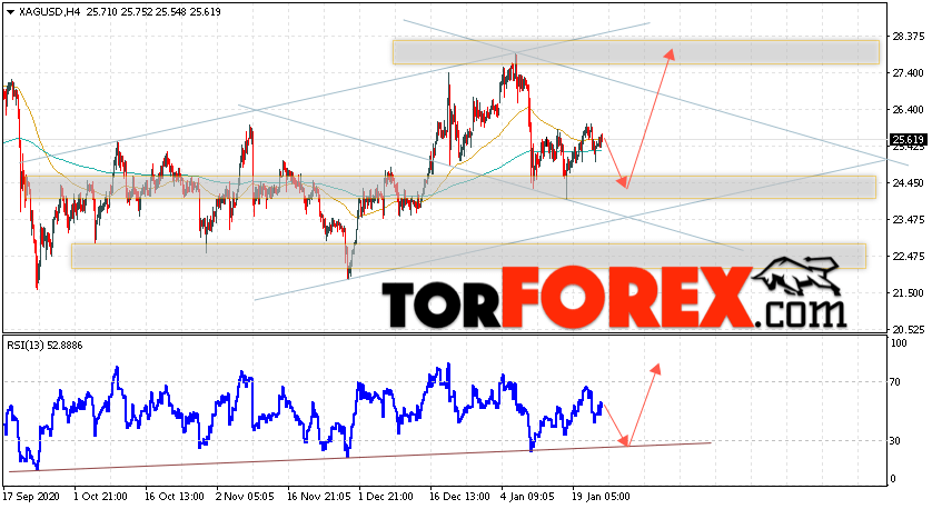 Дополнительным сигналом в пользу подъёма котировок и цен на Серебро XAG/USD выступит тест линии поддержки на индикаторе относительной силы. Вторым сигналом в пользу роста станет отскок от верхней границы нисходящего канала. Отменой варианта роста цен на Серебро 26 января 2021 станет падение и пробой 22.85. Это укажет на пробой области поддержки и продолжение падения в область ниже уровня 20.65. Ожидать ускорения подъёма котировок XAG/USD стоит с пробоем области сопротивления и закрытием цены над уровнем 26.55.