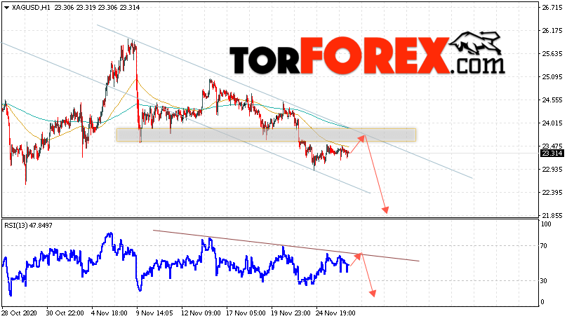 Дополнительным сигналом в пользу снижения котировок и цен на Серебро XAG/USD выступит тест линии сопротивления на индикаторе относительной силы. Вторым сигналом в пользу падения станет отскок от верхней границы нисходящего канала. Отменой варианта падения цен на Серебро 27 ноября 2020 станет сильный рост и пробой 24.15. Это укажет на пробой области сопротивления и продолжение роста в область выше уровня 27.65. Ожидать ускорения падения котировок XAG/USD стоит с пробоем области поддержки и закрытием цен под уровнем 22.55.