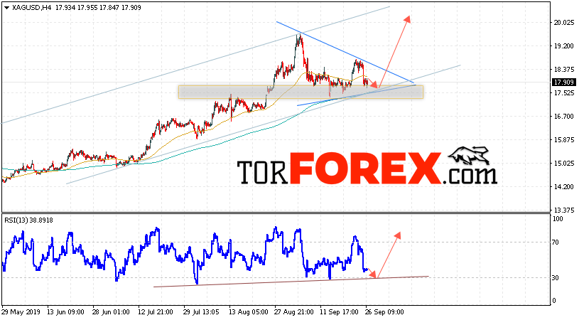 В пользу роста котировок и цен на Серебро XAG/USD выступит тест восходящей линии поддержки на индикаторе относительной силы. Вторым сигналом в пользу подъёма станет отскок от нижней границы восходящего канала. Отменой варианта роста цен на Серебро 27 сентября 2019 станет сильное падение и пробой 17.25. Это укажет на пробой нижней границы восходящего канала и продолжение падения в область ниже уровня 16.95. Ожидать ускорения роста котировок XAG/USD стоит с пробоем области сопротивления и закрытием над уровнем 18.75, что укажет на выход котировок за пределы модели «Треугольник».