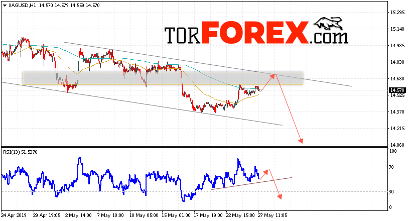 В пользу подъёма котировок XAG/USD выступит тест нисходящей линии тренда на индикаторе относительной силы (RSI). Вторым сигналом станет отскок от верхней границы нисходящего канала. Отменой варианта падения цен на Серебра 28 мая 2019 станет сильный рост и пробой 14.95. Это укажет на пробой верхней границы модели и продолжение роста в область выше уровня 15.65. Ожидать ускорения падения котировок XAG/USD стоит с пробоем области поддержки и закрытием ниже уровня 14.45.