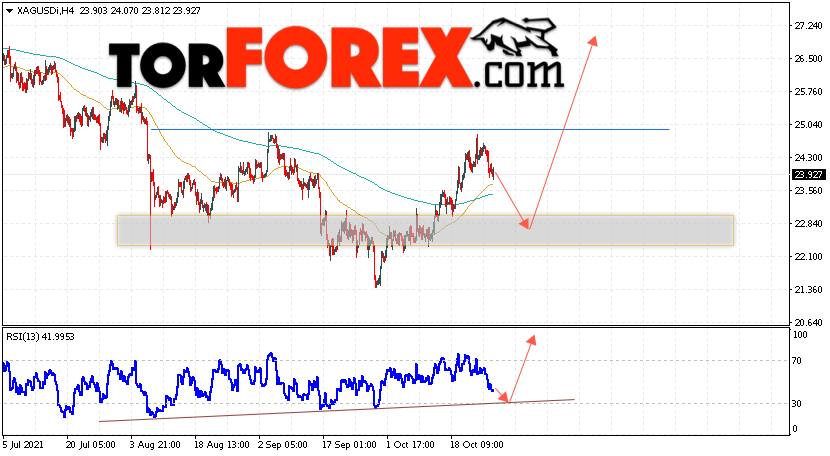 Дополнительным сигналом в пользу подъёма котировок и цен на Серебро XAG/USD выступит тест линии тренда на индикаторе относительной силы (RSI). Вторым сигналом в пользу роста станет отскок от верхней границы медвежьего канала. Отменой варианта подъёма цен на Серебро 28 октября 2021 станет падение и пробой 21.55. Это укажет на пробой области поддержки и продолжение падения в область ниже уровня 17.25. Ожидать ускорения подъёма котировок XAG/USD стоит с пробоем области сопротивления и закрытием цены над уровнем 25.25, что укажет на завершение формирования разворотной модели ”Голова и плечи”.