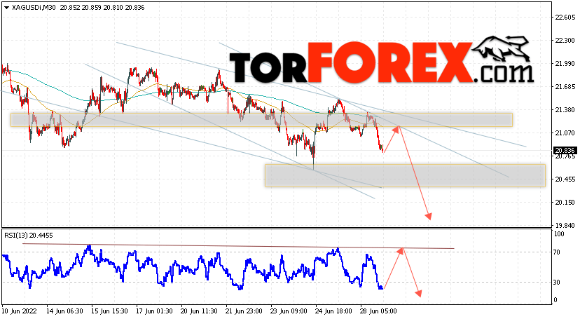 Дополнительным сигналом в пользу падения котировок и цен на Серебро XAG/USD выступит тест линии сопротивления на индикаторе относительной силы (RSI). Вторым сигналом в пользу падения станет отскок от верхней границы медвежьего канала. Отменой варианта падения цен на Серебро 29 июня 2022 станет сильный рост и пробой 21.75. Это укажет на пробой области сопротивления и продолжение роста в область выше уровня 22.75. Ожидать ускорения падения котировок XAG/USD стоит с пробоем области поддержки и закрытием цены под уровнем 20.35.