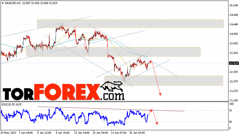 Дополнительным сигналом в пользу снижения котировок и цен на Серебро XAG/USD выступит тест линии сопротивления на индикаторе относительной силы (RSI). Вторым сигналом в пользу падения станет отскок от верхней границы медвежьего канала. Отменой варианта падения цен на Серебро 29 июня 2023 станет сильный рост и пробой 23.35. Это укажет на пробой области сопротивления и продолжение роста в область выше уровня 26.05. Ожидать ускорения падения котировок XAG/USD стоит с пробоем области поддержки и закрытием цены под уровнем 22.35, что укажет на пробой нижней границы бычьего канала коррекции.