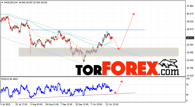 Дополнительным сигналом в пользу подъёма котировок и цен на Серебро XAG/USD выступит тест линии тренда на индикаторе относительной силы (RSI). Вторым сигналом в пользу роста станет отскок от верхней границы медвежьего канала. Отменой варианта подъёма цен на Серебро 29 октября 2021 станет падение и пробой 21.55. Это укажет на пробой области поддержки и продолжение падения в область ниже уровня 17.25. Ожидать ускорения подъёма котировок XAG/USD стоит с пробоем области сопротивления и закрытием цены над уровнем 25.25, что укажет на завершение формирования разворотной модели ”Голова и плечи”.
