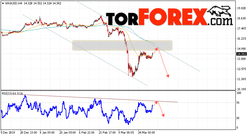 Дополнительным сигналом в пользу падения котировок и цен на Серебро XAG/USD выступит тест линии сопротивления на индикаторе относительной силы. Вторым сигналом в пользу снижения станет отскок от верхней границы нисходящего канала. Отменой варианта падения цен на Серебро 3 апреля 2020 станет сильный рост и пробой 16.20. Это укажет на пробой области сопротивления и продолжение роста в область выше уровня 17.05. Ожидать ускорения падения котировок XAG/USD стоит с пробоем области поддержки и закрытием под уровнем 13.60.
