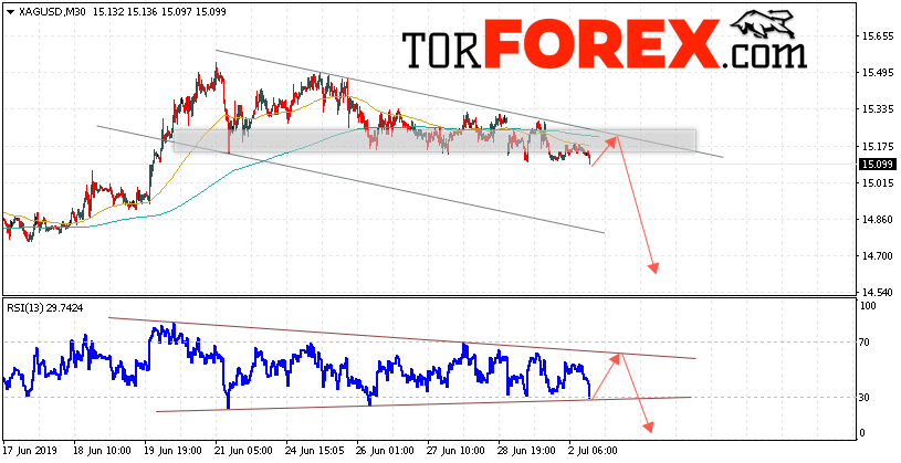 В пользу падения котировок XAG/USD выступит тест линии сопротивления на индикаторе относительной силы. Вторым сигналом станет отскок от верхней границы нисходящего канала. Отменой варианта падения цен на Серебро 3 июля 2019 станет сильный рост и пробой 15.35. Это укажет на пробой области сопротивления и продолжение роста в область выше уровня 15.75. Ожидать ускорения падения котировок XAG/USD стоит с пробоем области поддержки и закрытием ниже уровня 15.05.
