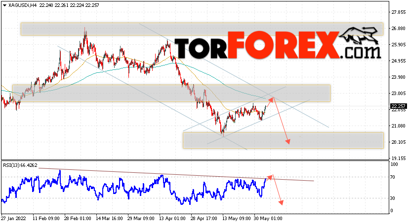 Дополнительным сигналом в пользу падения котировок и цен на Серебро XAG/USD выступит тест линии сопротивления на индикаторе относительной силы (RSI). Вторым сигналом в пользу падения станет отскок от верхней границы медвежьего канала. Отменой варианта падения цен на Серебро 3 июня 2022 станет сильный рост и пробой 23.20. Это укажет на пробой области сопротивления и продолжение роста в область выше уровня 24.75. Ожидать ускорения падения котировок XAG/USD стоит с пробоем области поддержки и закрытием цены под уровнем 20.75, что укажет на пробой нижней границы бычьего канала коррекции.