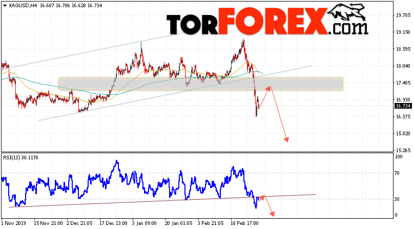 Дополнительным сигналом в пользу падения котировок и цен на Серебро XAG/USD выступит тест линии сопротивления на индикаторе относительной силы. Вторым сигналом в пользу снижения станет отскок от нижней границы восходящего канала. Отменой варианта падения цен на Серебро 3 марта 2020 станет сильный рост и пробой 18.15. Это укажет на пробой области сопротивления и продолжение роста в область выше уровня 18.75. Ожидать ускорения падения котировок XAG/USD стоит с пробоем области поддержки и закрытием под уровнем 16.15.
