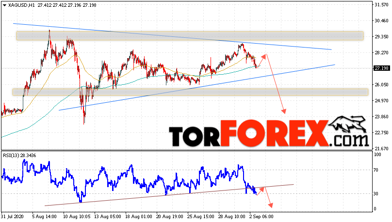 Дополнительным сигналом в пользу падения котировок и цен на Серебро XAG/USD выступит тест линии сопротивления на индикаторе относительной силы. Вторым сигналом в пользу снижения станет отскок от верхней границы модели ”Треугольник”. Отменой варианта падения цен на Серебро 3 сентября 2020 станет сильный рост и пробой 29.85. Это укажет на пробой области сопротивления и продолжение подъёма в область выше уровня 32.65. Ожидать ускорения падения котировок XAG/USD стоит с пробоем области поддержки и закрытием цен под уровнем 26.75, что укажет на начало отработки модели ”Треугольник”.