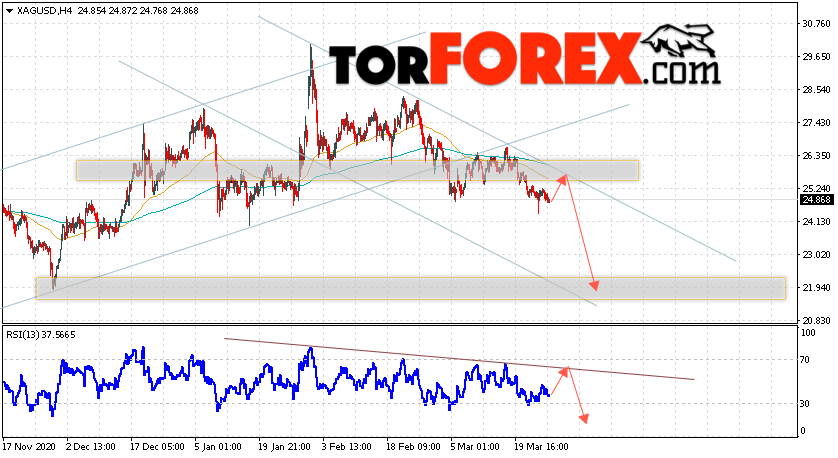 Дополнительным сигналом в пользу падения котировок и цен на Серебро XAG/USD выступит тест линии сопротивления на индикаторе относительной силы. Вторым сигналом в пользу снижения станет отскок от верхней границы нисходящего канала. Отменой варианта падения цен на Серебро 30 марта 2021 станет сильный рост и пробой 26.85. Это укажет на пробой области сопротивления и продолжение подъёма в область выше уровня 29.65. Ожидать ускорения падения котировок XAG/USD стоит с пробоем области поддержки и закрытием цены под уровнем 23.95.