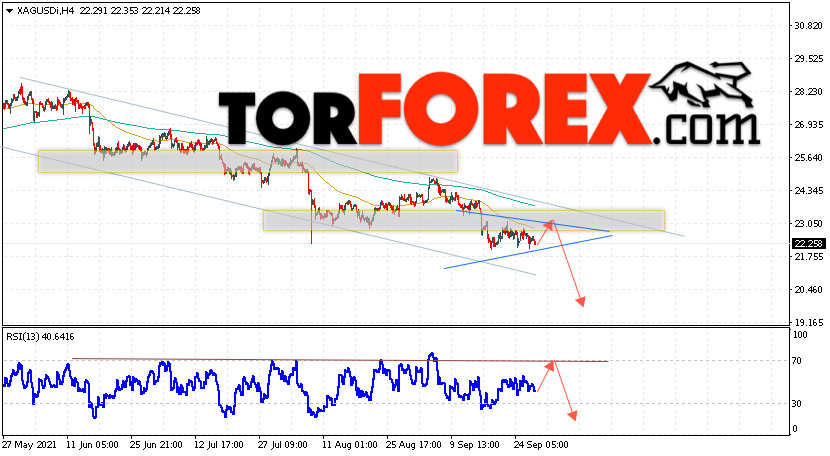 Дополнительным сигналом в пользу падения котировок и цен на Серебро XAG/USD выступит тест линии тренда на индикаторе относительной силы (RSI). Вторым сигналом в пользу снижения станет отскок от верхней границы модели ”Треугольник”. Отменой варианта падения цен на Серебро 30 сентября 2021 станет сильный рост и пробой 23.85. Это укажет на пробой области сопротивления и продолжение подъёма в область выше уровня 26.45. Ожидать ускорения падения котировок XAG/USD стоит с пробоем области поддержки и закрытием цены под уровнем 21.25, что укажет на пробой нижней границы модели ”Треугольник”.