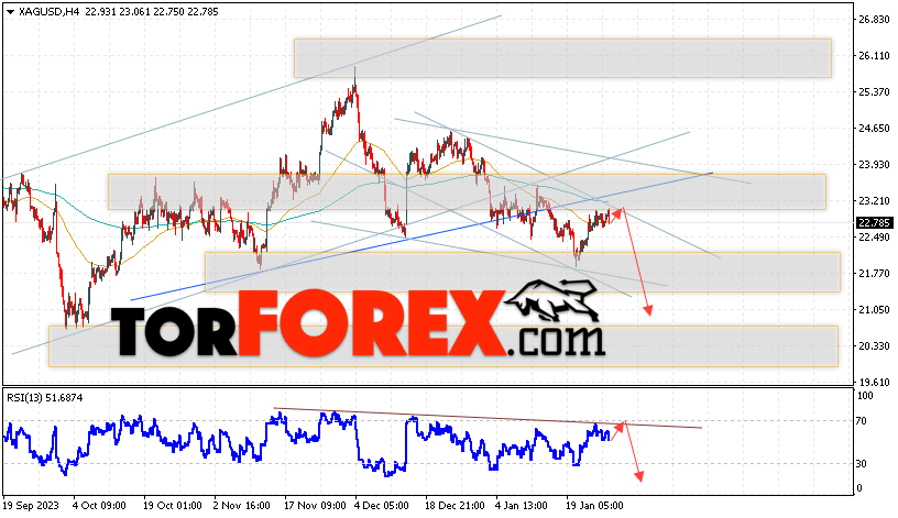 Дополнительным сигналом в пользу падения котировок и цен на Серебро XAG/USD выступит тест линии сопротивления на индикаторе относительной силы (RSI). Вторым сигналом в пользу снижения станет отскок от верхней границы медвежьего канала. Отменой варианта падения цен на Серебро 30 января 2024 станет сильный рост и пробой 23.35. Это укажет на пробой области сопротивления и продолжение роста в область выше уровня 25.15. Ожидать ускорения падения котировок XAG/USD стоит с пробоем области поддержки и закрытием цены под уровнем 22.35.