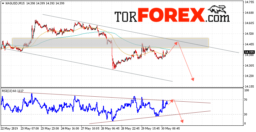 В пользу подъёма котировок XAG/USD выступит тест нисходящей линии тренда на индикаторе относительной силы (RSI). Вторым сигналом станет отскок от верхней границы нисходящего канала. Отменой варианта падения цен на Серебра 31 мая 2019 станет сильный рост и пробой 14.65. Это укажет на пробой верхней границы канала и продолжение роста в область выше уровня 15.15. Ожидать ускорения падения котировок XAG/USD стоит с пробоем области поддержки и закрытием ниже уровня 14.25.