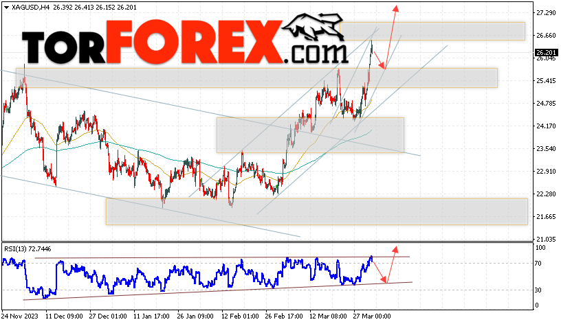 Дополнительным сигналом в пользу роста котировок и цен на Серебро XAG/USD выступит тест линии поддержки на индикаторе относительной силы (RSI). Вторым сигналом в подъёма роста станет отскок от нижней границы бычьего канала. Отменой варианта подъёма цен на Серебро 4 апреля 2024 станет падение и пробой 24.65. Это укажет на пробой области поддержки и продолжение падения в область ниже уровня 22.15. Ожидать ускорения роста котировок XAG/USD стоит с пробоем области сопротивления и закрытием цены над уровнем 26.75.
