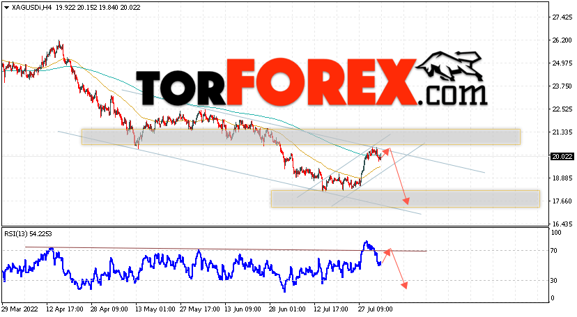 Дополнительным сигналом в пользу падения котировок и цен на Серебро XAG/USD выступит тест линии сопротивления на индикаторе относительной силы (RSI). Вторым сигналом в пользу падения станет отскок от верхней границы нисходящего канала. Отменой варианта падения цен на Серебро 4 августа 2022 станет сильный рост и пробой 21.45. Это укажет на пробой области сопротивления и продолжение роста в область выше уровня 22.75. Ожидать ускорения падения котировок XAG/USD стоит с пробоем области поддержки и закрытием цены под уровнем 18.75, что укажет на пробой нижней границы бычьего канала коррекции.