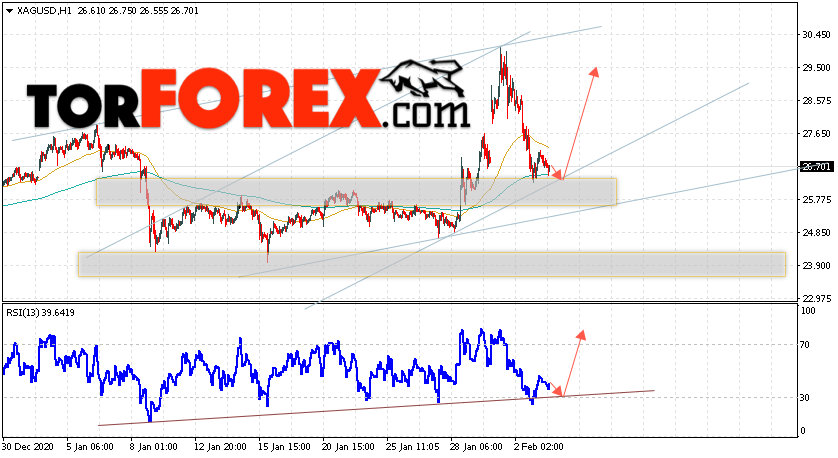 Дополнительным сигналом в пользу подъёма котировок и цен на Серебро XAG/USD выступит тест линии поддержки на индикаторе относительной силы. Вторым сигналом в пользу роста станет отскок от нижней границы восходящего канала. Отменой варианта роста цен на Серебро 4 февраля 2021 станет падение и пробой 25.65. Это укажет на пробой области поддержки и продолжение падения в область ниже уровня 22.85. Ожидать ускорения подъёма котировок XAG/USD стоит с пробоем области сопротивления и закрытием цены над уровнем 27.85.