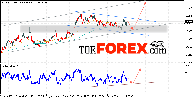 В пользу падения котировок XAG/USD выступит тест линии поддержки на индикаторе относительной силы. Вторым сигналом станет отскок от нижней границы бычьего канала. Отменой варианта роста цен на Серебро 4 июля 2019 станет падение и пробой 14.90. Это укажет на пробой области поддержки и продолжение снижения в область ниже уровня 14.35. Ожидать ускорения роста котировок XAG/USD стоит с пробоем верхней границы нисходящего канала и закрытием над уровнем 15.65.